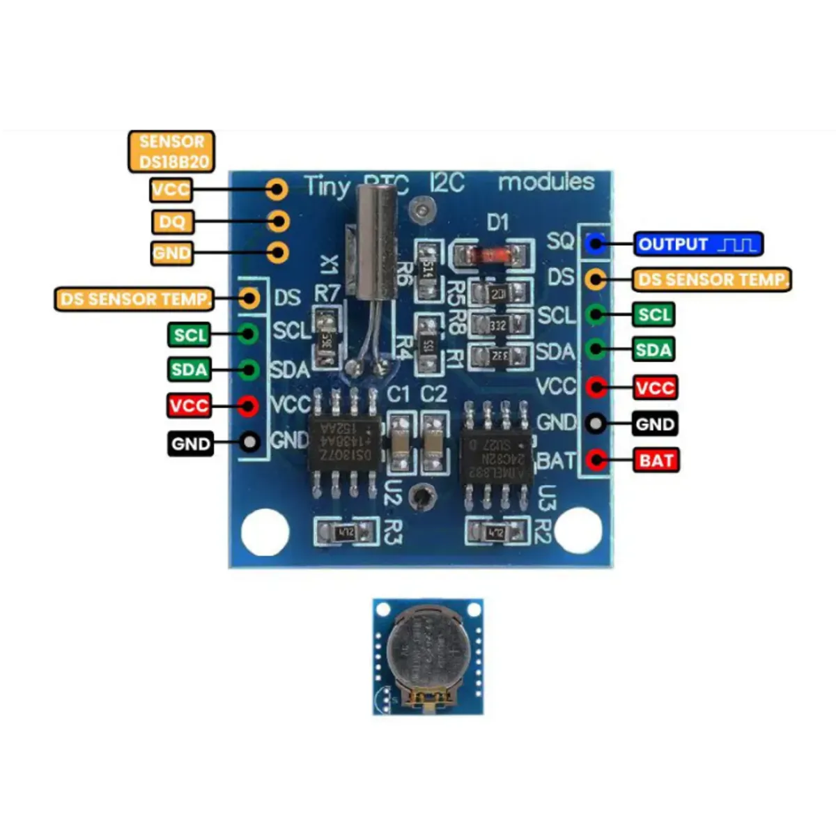 یک ساعت دقیق RTC است که با رابط I2C به میکروکنترلر وصل شده و زمان، تاریخ و ثانیهها را حتی در هنگام قطع برق، با استفاده از باتری پشتیبان CR2032 ذخیره میکند. این ماژول بهدلیل قیمت مناسب، دقت بالا و نصب آسان گزینهای عالی برای خرید در پروژههایی مانند ساعت دیجیتال، دیتالاگر، سیستمهای هوشمند و آردوینو است.